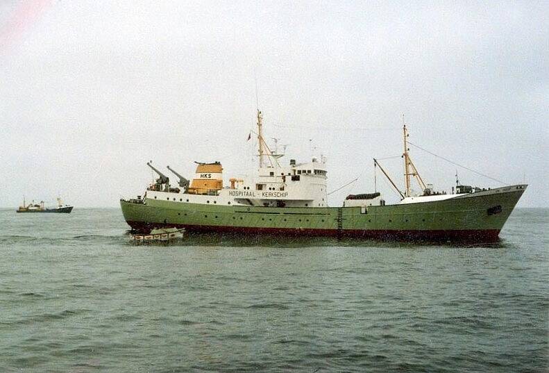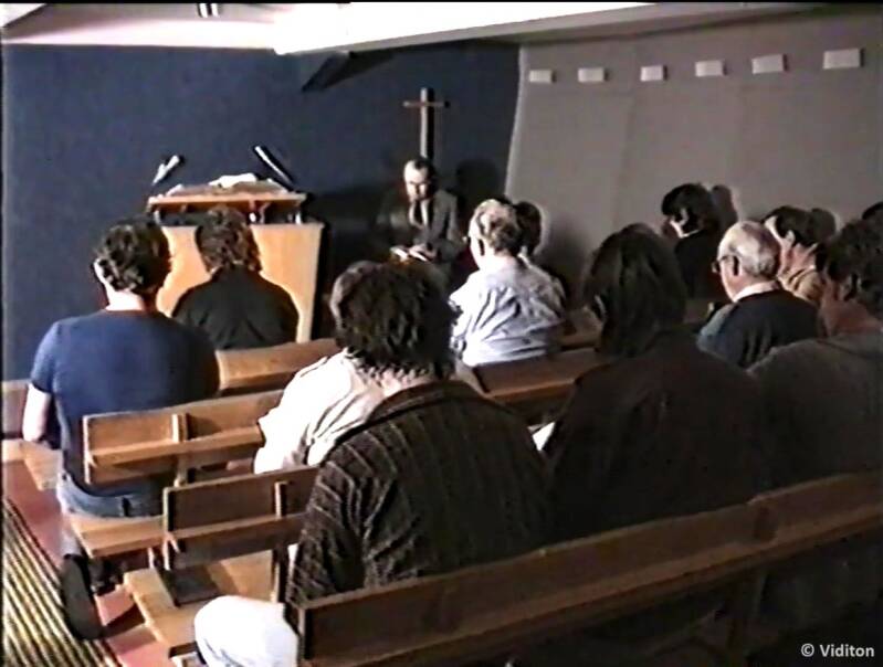 De bemanning hier in de kerkzaal aan boord van De Hoop tijdens de dagsluiting/kerkdienst die ook werd uitgezonden via de visserijband, zodat ook schepen elders op zee deze konden beluisteren. Verschillende predikanten voeren dan mee die in de diensten voorgingen, waarvan ds. H. Zethof uit Kockengen het merendeel van de reizen meemaakte.